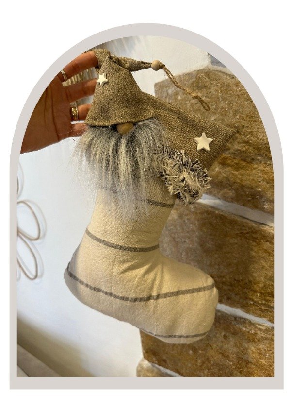 Esta encantadora bota decorativa combina la calidez de los tonos neutros con la ternura de un pequeño duende nórdico. Confeccionada en lino y algodón natural, lleva un gorro rústico con estrellas y una barba suave que aporta textura y encanto.