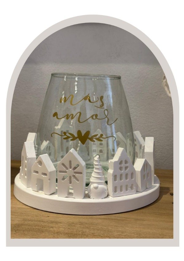 Este fanal de vidrio, rodeado por pequeñas casitas blancas, crea un efecto cálido y mágico cuando se enciende una vela o luz interior.