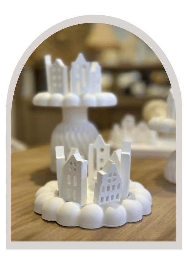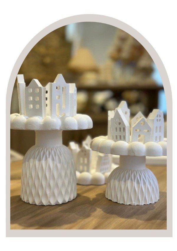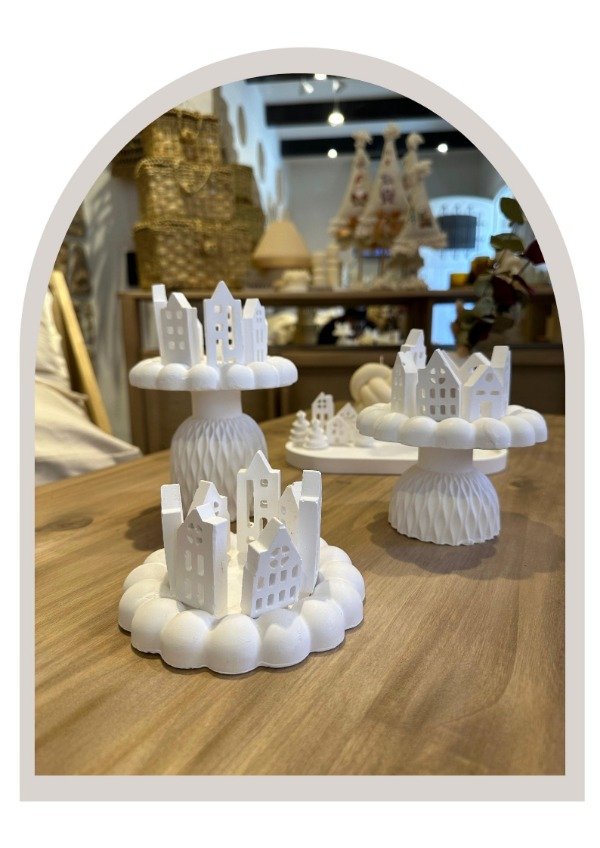 Inspiradas en los pequeños pueblos del norte, estas delicadas casitas blancas crean una escena encantadora y serena. Realizadas en cerámica (o resina, si preferís que lo aclare según el material), presentan un diseño minimalista con suaves volúmenes y una base texturada que les da un aire artesanal y sofisticado.