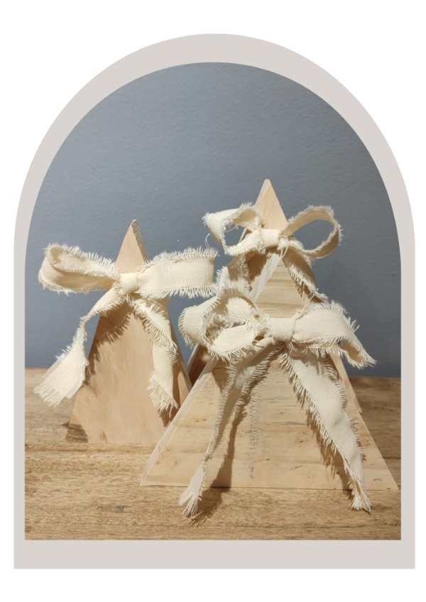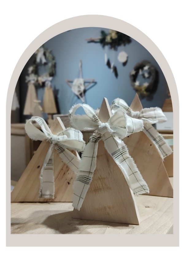 Hecho en madera natural, este pino conserva el encanto rústico y artesanal, realzado con un delicado moño que aporta un toque festivo sin perder la calidez de lo hecho a mano.