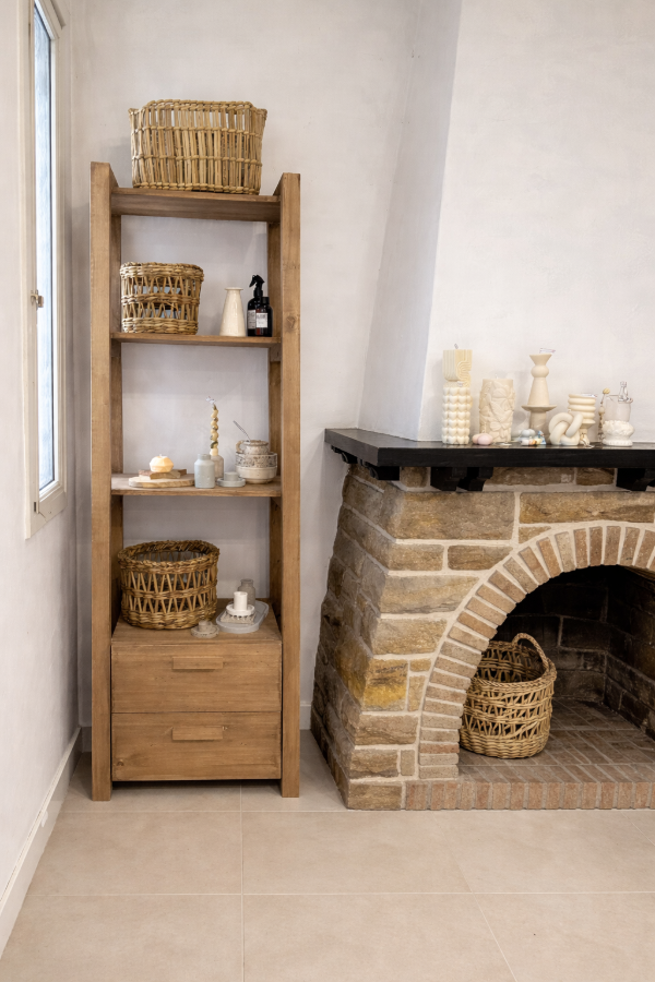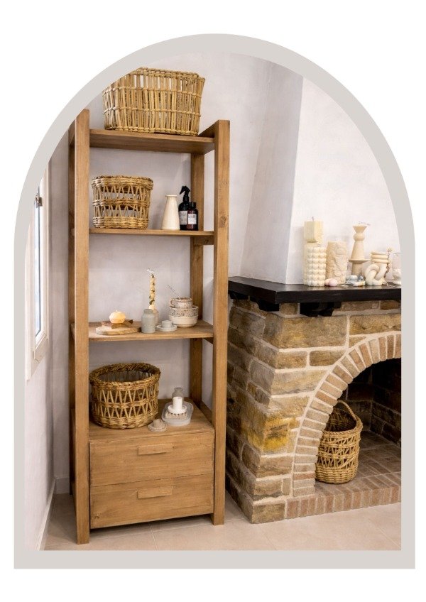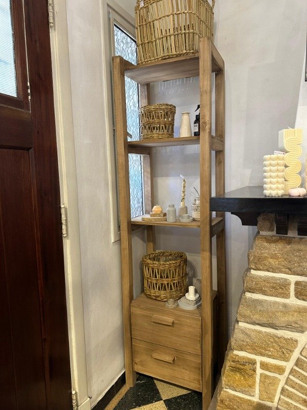 Biblioteca de madera, mueble auxiliar práctico y versátil pensado para organizar y exhibir objetos decorativos, libros o elementos de uso cotidiano. Su diseño simple y vertical permite aprovechar el espacio en altura, aportando orden y calidez al ambiente.