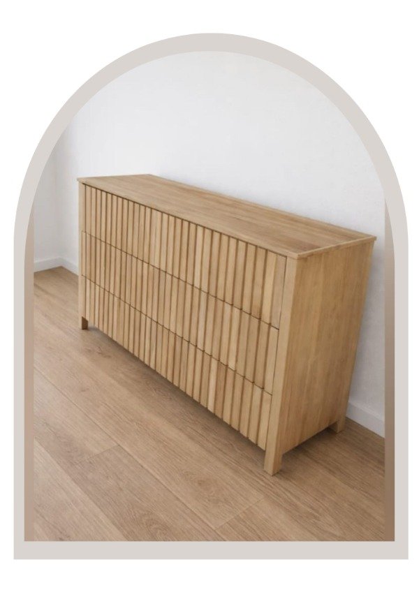 Cómoda varillada en madera de álamo macizo, una pieza que destaca por su diseño elegante y su textura natural. El detalle de varillado aporta profundidad y carácter, generando un juego de luces y sombras que realza el mueble y suma calidez al ambiente.