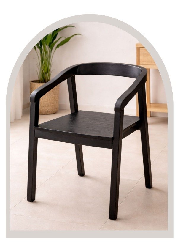 Silla de comedor en madera con apoyabrazos, de diseño moderno y elegante. Sus líneas curvas y estructura firme combinan estética y comodidad, logrando una pieza ideal para espacios de comedor o áreas sociales.